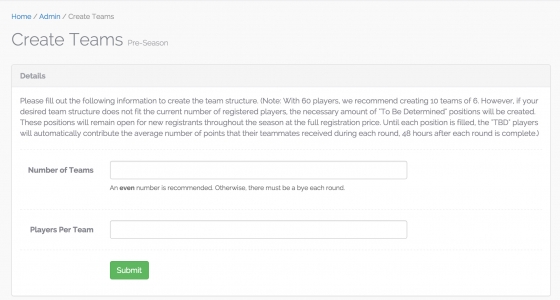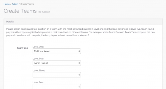 Once players have registered for your leagues, the team structure can be created. You can assign the (a) number of teams, and (b) number of levels.